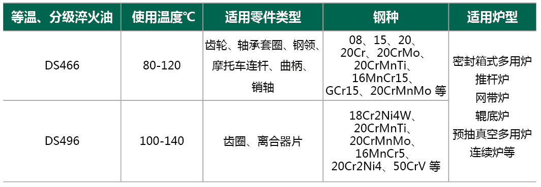 等溫、分級淬火油系列,主要用于工件的等溫淬火和分級淬火,相應指標能很好的滿足工藝要求,有效控制工件的變形及開裂,并獲得良好的綜合機械性能。能顯著減小汽車齒輪、摩托車齒輪離合器片、軸承套圈等壁薄以及形狀復雜工件的淬火變形,提高了產品精度,減小工件的加工余量,節約成本。